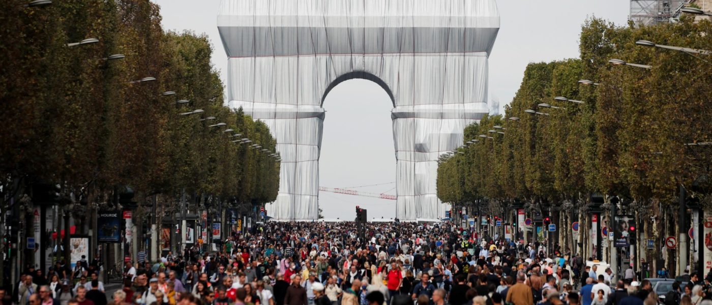 Os pedestres que passeavam pela via mais famosa de Paris puderam ver o “Arco do Triunfo Embrulhado”.