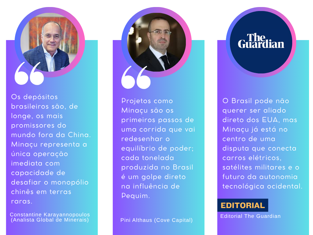 Isso porque, hoje, a China domina cerca de 90% do refino global de terras raras e, segundo especialistas aduaneiros, usou essa vantagem como arma estratégica, em abril, quando restringiu exportações para retaliar tarifas impostas pelos EUA. Para especialistas, o gesto foi um alerta claro de que a hegemonia chinesa nesse setor é mais poderosa do que muitos supunham. O analista geopolítico Constantine Karayannopoulos, uma das maiores autoridades globais em minerais estratégicos, afirmou recentemente que “os depósitos brasileiros são, de longe, os mais promissores do mundo fora da China, e Minaçu representa a única operação com potencial imediato para desafiar o monopólio chinês”.