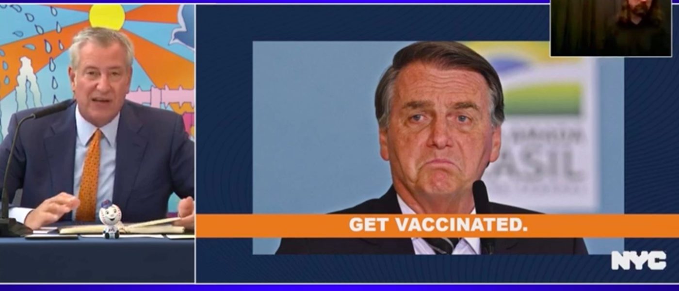 O presidente brasileiro é o único líder entres as maiores economias do planeta que declaradamente não tomou ainda o imunizante contra a Covid-19. Pronunciamento do prefeito Bill de Blasio, de Nova York, em 20 de setembro de 2021